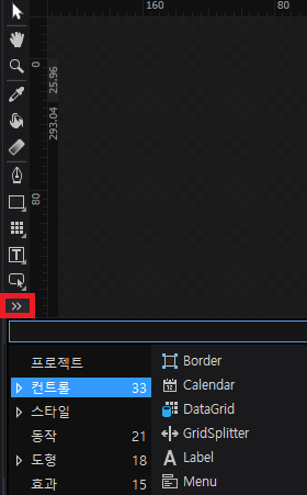 2.1 먼저 MainWindow.xaml 파일을 선택하고 창의 왼쪽에 아이콘 리스트 맨 아래에 >> 라고 것을 누르면 창이 나온다.