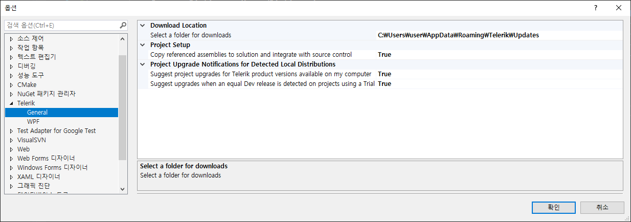자동 업데이트를 해서 최신 버전이 아래 경로에 설치가 되어져 있다. 설치 경로는 TELERIK 옵션을 통해 확인한다.