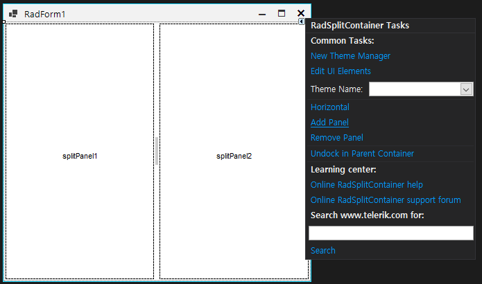 5) Add Panel을 눌러 RadSplitContainer에 panel을 추가한다.
