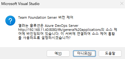 | 열려는 솔루션은 Azure DevOps Server http://192.168.11.40:8080/tfs/general%20applications의 소스 제어에 바인딩되어 있습니다. 이 서버에 연결하여 소스 제어 통합을 사용하도록 설정하시겠습니까? |