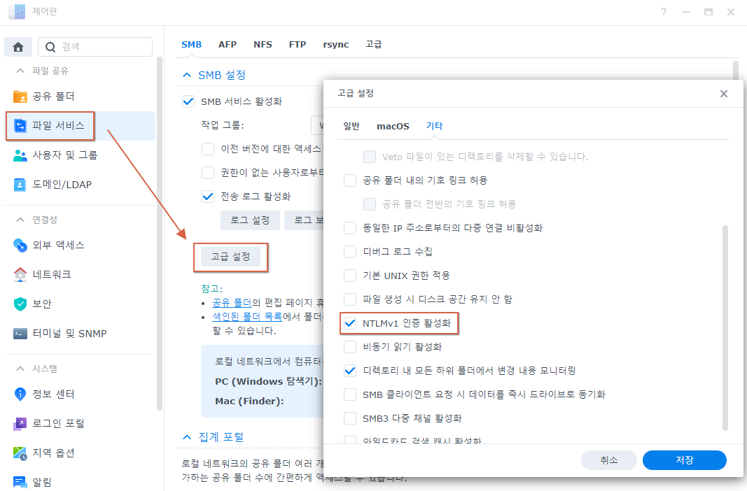 그래서 검색을 해보니 DSM 7.x버전으로 업데이트 되면서 보안이슈로 인해서 NTLMv1 인증 활성화가 자동으로 해제되어 있다고 한다.