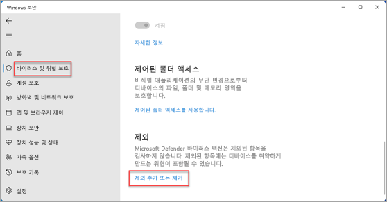 위와 같이 "제외 추가 또는 제거" 메뉴를 통해 문제가 되는 실행 파일 또는 폴더, 프로세스를 등록해서 사용을 하면 윈도우디펜더(windows defender)가 자동으로 삭제하거나 실행을 막지는 않는다.