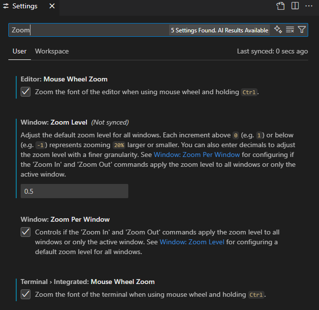 - User - Window: Zoom Level 의 값을 변경해서 원하는 크기 설정