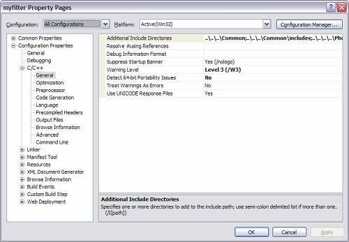 ..\..\..\Output\Win\Release\myfilter.8bfor..\..\..\Output\Win\Debug\myfilter.8bf - If the plug-in does not build correctly, check all the steps above and ensure you have followed them correctly. As a final check, you can verify all the project property pages of your new plug-in with the project property pages of the plug-in you copied from.