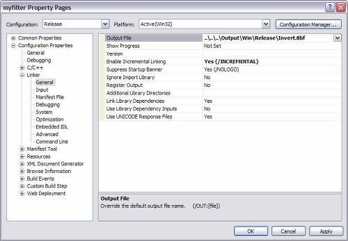 ..\..\..\Output\Win\Release\myfilter.8bfReplacing "myfilter with the name of your plug-in. (.8bf is the extension for filter plug-in files.) - In the "Enable Incremental Linking field", select "Yes"