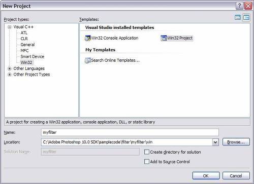 C:\Adobe Photoshop 10.0 SDK\samplecode\filter\myfilter\win. - Do not check "Create Directory for Solution"