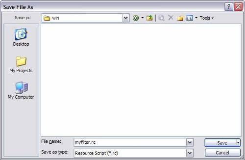 ..\samplecode\filter\myfilter\win. - Choose "Save As Type" to be "Resouce Script (.rc)".