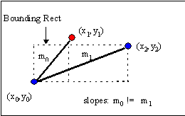 In Figure 2, the point (x1, y1) is obviously within the bounding rectangle. Comparing the slopes of the two lines makes sense in this case.