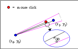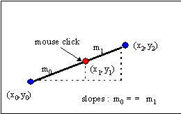 In this scenario, the user is attempting to select a previously drawn line. There are many methods for detecting the presence of a point (the mouse click) on or near a line. The simplest but least accurate test is to detect if the point is within the rectangular area bounding the line. This works great if the line is horizontal or vertical, but it is obviously less useful for lines that are not parallel to the x or y axes. However, by using the bounding rectangle you can quickly determine if you should continue using this method or switch to a different, more accurate method to determine the distance of the point to the line. It is possible to use various algebraic methods involving the angle between the lines formed by one endpoint of the line, the point at the mouse click, and the second endpoint of the original line. However, having to deal with angles can be somewhat time consuming (unless you have a lookup table). A more reasonable approach might involve comparing the slopes of the two lines. As we will see, this approach also has some problems.
