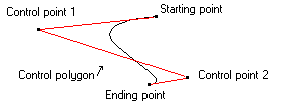 Hit testing a Bézier curve presents a challenge. If you use the Bézier functions, the points used to draw the line are not immediately available to you. Consider thePolyBezier function. This function takes as a parameter a pointer to an array of POINT structures that contain the endpoints and control points of the spline(s). Do not mistake these control points for the actual points used to draw the curve. Figure 6 illustrates a Bézier curve and the control points used to determine the shape of the curve. The control polygon (not to be confused with the convex hull) is simply the polygon formed by the control points. It should be clear that the points on the curve itself are not specified. The PolyBezier function is responsible for generating the points that lie on the curve. You may recall that the Bézier curves may be generated as a special case of B-spline curves (if you don't recall this, I recommend that you take a look at one of the many textbooks available on the subject). Windows implements Bézier curves as cubic B-splines. There is much more to the subject of Bézier curves than this simple explanation—the point I am making is that these four points, in and of themselves, are not sufficient to determine if a mouse click is on the line generated by a Bézier curve.