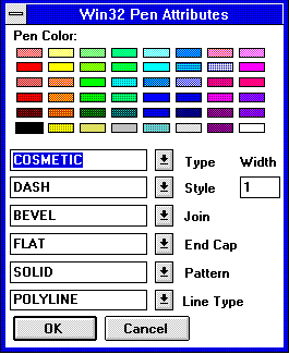 To draw a line or curve in the workspace of W32HIT, press the left mouse button while the mouse cursor is over the workspace (denoted by the presence of the left-slanted pen cursor). This brings up the pen and line selection dialog box as shown in Figure 7.