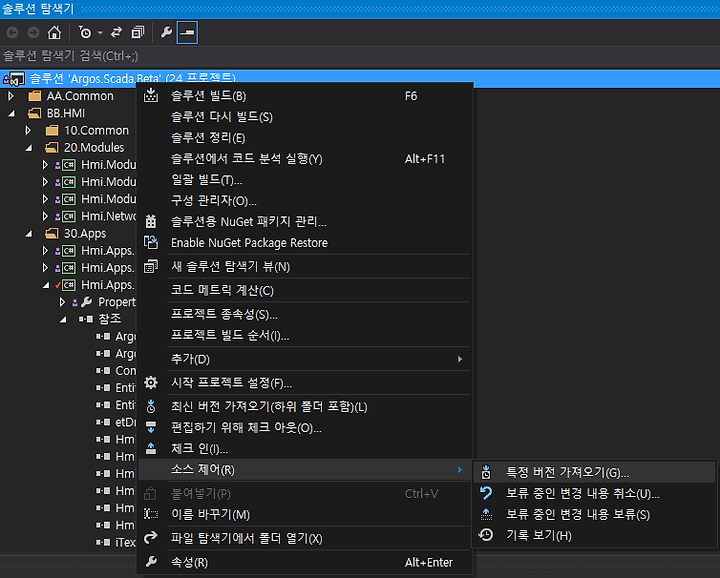 서버에서 소스를 받기 위해서는 "솔루션"을 선택하고 오른쪽 마우스를 클릭해서 "소스제어"를 선택한다.