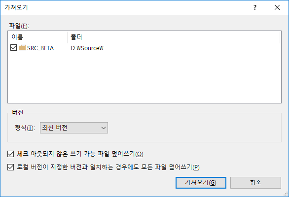 위와 같이 "최신 버전"을 선택하고아래 체크 박스에서 필요한 것을 선택한 후 "가져오기" 버튼을 누른다.