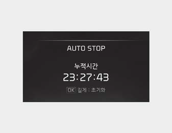 AUTO STOP 누적 시간은 시:분:초로 표시됩니다. AUTO STOP 누적 시간은 초기화 하기 전까지 누적되며 스티어링 휠의「OK」 버튼을 길게 누르면 초기화됩니다.